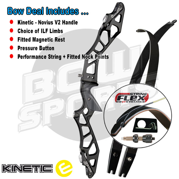 Kinetic - Novius V2 Handle - 25" Choice of ILF limbs Magnetic Rest Pressure Button Fast Flight Sting with fitted nock points We also set tiller, pressure button and limb alignmentGetting into archery?