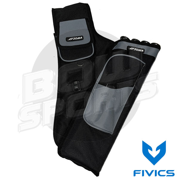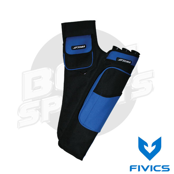 Adult 4 tube quiver made from tough Rypstop Nylon Large zipper pocket on main body with smaller velco fastening pocket, outer sleeve pocket for pencil/pen etc. Also has a hook and a metal D ring for attaching arrow puller arrow cleaning tassel etc. Supplied with rugged belt with reinforcing where it loops through the quiver.