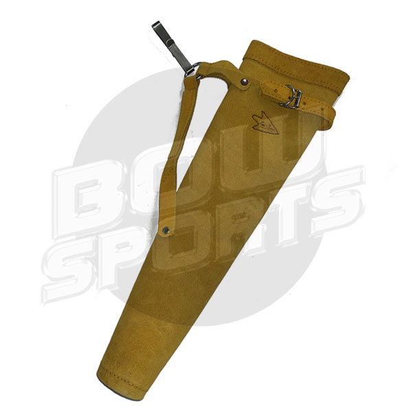 Suede leather side quiver with clip to easily take on or off.approx 6" wide and max 19" deep